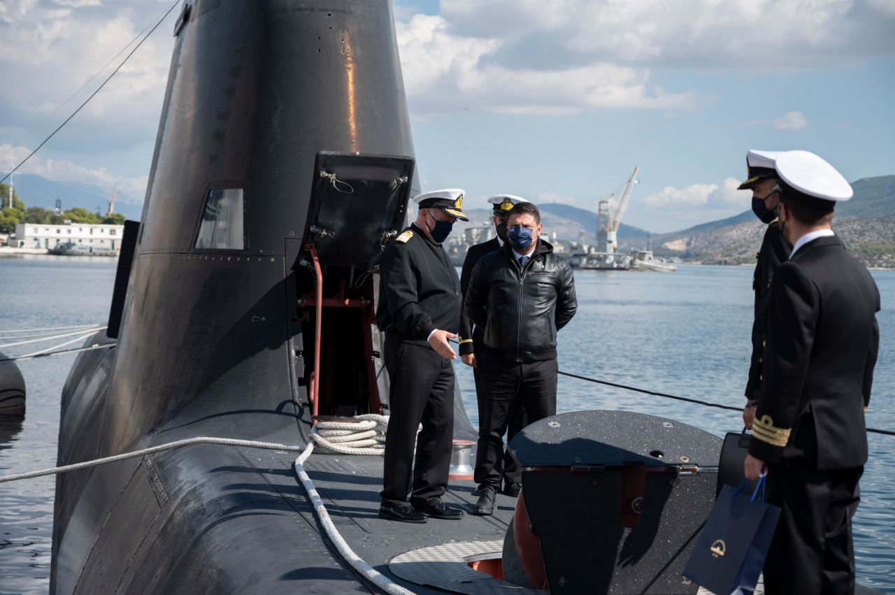 Τον Υφυπουργό Εθνικής Άμυνας συνόδευε ο Αρχηγός ΓΕΕΘΑ Στρατηγός Κωνσταντίνος Φλώρος και ο Αρχηγός ΓΕΝ Αντιναύαρχος Στυλιανός Πετράκης ΠΝ. Στο Αρχηγείο Στόλου (ΑΣ) στο Ναύσταθμο Σαλαμίνας, τους υποδέχθηκε ο Αρχηγός Στόλου, Αντιναύαρχος Παναγιώτης Λυμπέρης ΠΝ.