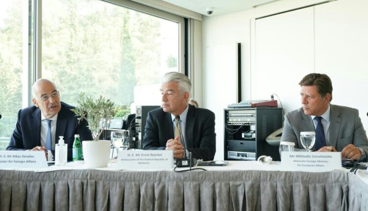 Ο υπουργός Εξωτερικών Νίκος Δένδιας και ο αναπληρωτής υπουργός Εξωτερικών Μιλτιάδης Βαρβιτσιώτης συμμετείχαν στο πρόγευμα εργασίας με τους πρέσβεις των κρατών-μελών της ΕΕ στη χώρα μας που διοργάνωσε η γερμανική πρεσβεία στην Ελλάδα και ο Γερμανός πρέσβης Έρνστ Ράιχελ.