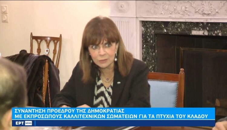 Η Πρόεδρος της Δημοκρατίας Κατερίνα Σακελλαροπούλου συναντήθηκε νωρίτερα την Πέμπτη, μετά από αίτημά τους, με τους προέδρους Σωματείων Καλλιτεχνών, καθώς και με εκπροσώπους Δραματικών Σχολών.