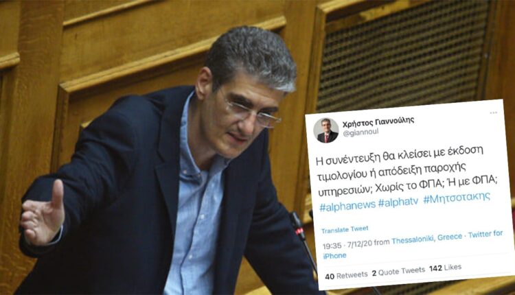 “Η συνέντευξη θα κλείσει με έκδοση τιμολογίου ή απόδειξη παροχής υπηρεσιών; Χωρίς το ΦΠΑ; Ή με ΦΠΑ;”, έγραψε ο κ. Γιαννούλης ο οποίος στο παρελθόν υπήρξε και αυτός δημοσιογράφος. “Στον ΣΚΑΙ μάλλον είχε συμπληρώσει τις 15 συνεργασίες τον μήνα που προέβλεπε η σύμβαση έργου!”, σχολίασε λίγο μετά, ενώ αφού ξέσπασε ο σάλος οι αναρτήσεις…εξαφανίστηκαν.