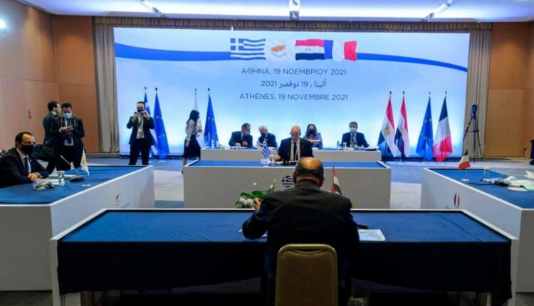 1. Σε συνέχεια της πρώτης μας συνάντησης, που πραγματοποιήθηκε τον Ιανουάριο του 2020 στο Κάιρο, και των αποτελεσμάτων και του τελικού ανακοινωθέντος, εμείς, οι υπουργοί Εξωτερικών της Ελλάδας, της Κύπρου, της Αιγύπτου και της Γαλλίας συναντηθήκαμε στην Αθήνα στις 19 Νοεμβρίου 2021, για να συζητήσουμε τις πρόσφατες εξελίξεις στην περιοχή, υπό το φως των πολύπλευρων προκλήσεων που επηρεάζουν την ειρήνη, τη σταθερότητα και την ασφάλεια.
