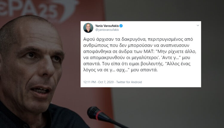 «Αποφάνθηκα σε άνδρα των ΜΑΤ: “Μην ρίχνετε άλλο, να απομακρυνθούν οι μεγαλύτεροι’. ‘Αντε γ…” μου απαντά. Του είπα ότι ειμαι βουλευτής. “Άλλος ένας λόγος να σε γ… αρχ…” μου απαντά», έγραψε στο Twitter ο Γιάνης Βαρουφάκης.