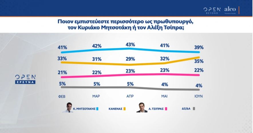 Την ίδια πολιτική κυριαρχία απολαμβάνει και ο Κυριάκος Μητσοτάκης έναντι του Αλέξη Τσίπρα (39% έναντι 22%).