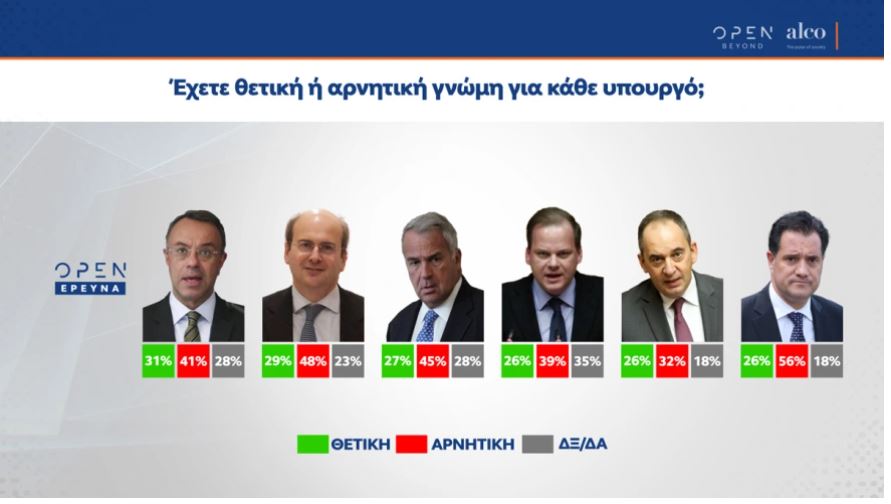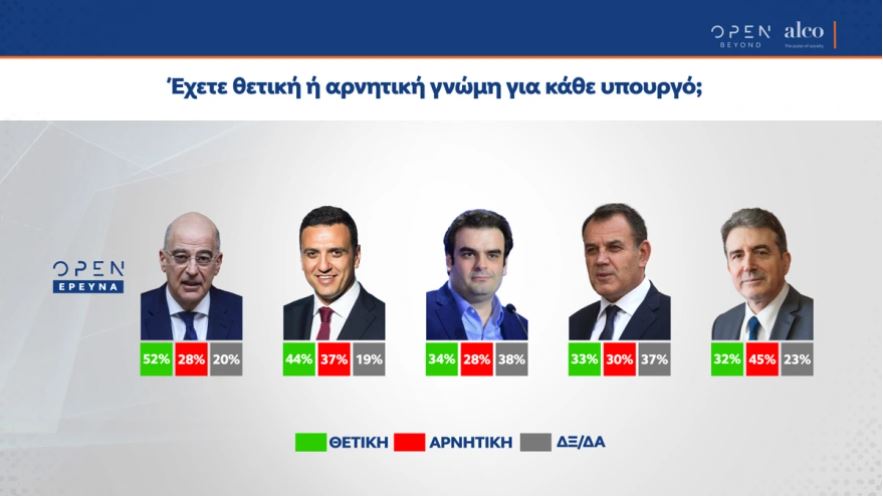 Ως προς τη δημοφιλία των υπουργών, η πρωτιά του Νίκου Δένδια και μάλιστα με μεγάλη διαφορά από τους συναδέλφους του, δεν είναι έκπληξη, όπως δεν ξενίζει κανέναν η άνοδος στην τρίτη θέση (μετά τον δεύτερο Β. Κικίλια) του Κυριάκου Πιερρακάκη με τέταρτο τον Νίκο Παναγιωτόπουλο. Ο Μιχάλης Χρυσοχοΐδης, παραμένει στην πρώτη πεντάδα, ενώ η έκτη θέση για τον Χρήστο Σταϊκούρα, δυσκολεύει σαφώς τα όποια σενάρια για αλλαγές στο οικονομικό επιτελείο – ίσως είναι από τους λόγους που δεν προκρίνεται ο ανασχηματισμός αυτή την περίοδο