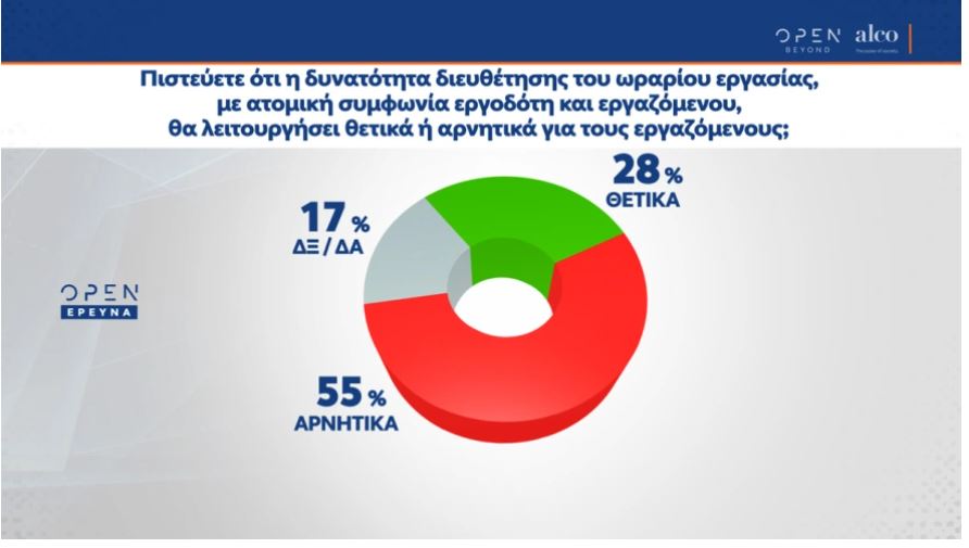 Τα δύο νέα καμπανάκια έχουν να κάνουν με την αρνητική τοποθέτηση επί του νέου εργασιακού και ειδικά για τη διευθέτηση του ωραρίου εργασίας και των υπερωριών. Μόλις το 28% επικροτεί τη ρύθμιση και είναι ίσως το πρώτο πεδίο που η δημοσκοπική επίδοση είναι τόσο χαμηλότερη της εκλογικής δύναμης της ΝΔ.