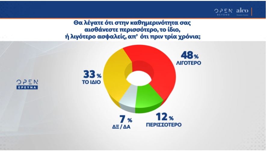Επίσης προς ανάλυση για το ποια θέματα μπορεί να αφορά ακριβώς, είναι και το εύρημα ότι το 48% των πολιτών δηλώνουν ότι νιώθουν λιγότερο ασφαλείς στην καθημερινότητά τους σε σχέση με τρία χρόνια πριν, ενώ 33% θεωρεί ότι δεν έχει αλλάξει κάτι και μόλις το 12% λέει ότι νιώθει καλύτερα τώρα.