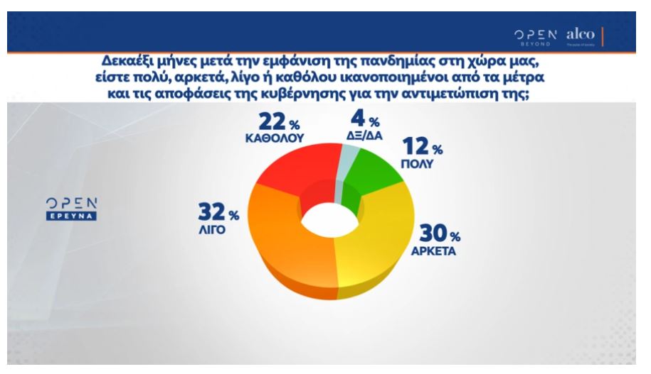 Το τελευταίο δεν αποτελεί έκπληξη, πιθανόν δεν πρόκειται να αποτελέσει ως πηγή νέων πολιτικών συμπερασμάτων, καθώς έχει καταγραφεί εδώ και καιρό μία δυσφορία των πολιτών για το πώς πήγε η πανδημία. Ικανοποιημένο από τους κυβερνητικούς χειρισμούς δηλώνει το 42%, ενώ την αντίθετη άποψη έχει το 54%. Το γεγονός ότι ο Βασίλης Κικίλιας είναι δεύτερος υπουργός σε θετικές γνώμες (πίσω μόνο από τον Νίκο Δένδια), μετριάζει ίσως την κατάσταση για την κυβέρνηση, αλλά σε κάθε περίπτωση, η εικόνα αυτή σε γενικές γραμμές, ήταν γνωστή στο Μαξίμου εδώ από μήνες, ειδικά με το τρίτο κύμα.