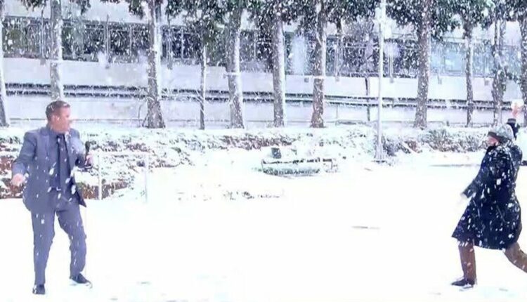 Χιονοπόλεμο έξω από το στούντιο βγήκαν να παίξουν οι Παναγιώτης Στάθης και Δημήτρης Καμπουράκης στο ξεκίνημα της εκπομπής τους «Ώρα Ελλάδος».