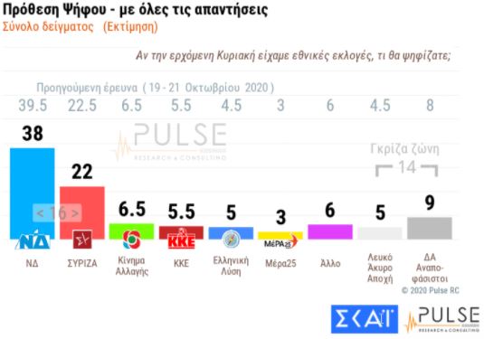 Εξάλλου στη δημοσκόπηση της Pulse η ΝΔ διατηρεί άνετο προβάδισμα έναντι του ΣΥΡΙΖΑ με 16% στην πρόθεση ψήφου, συγκεντρώνοντας 38% (39,5% στην προηγούμενη μέτρηση) έναντι 22% του ΣΥΡΙΖΑ (22,5% στην προηγούμενη μέτρηση). Το ΚΙΝΑΛ διατηρείται στην τρίτη θέση με 6,5% και ακολουθούν ΚΚ# (5,5%) και Ελληνική Λύση με 5%