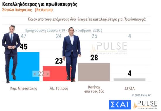 Ο Κυριάκος Μητσοτάκης παραμένει καταλληλότερος για πρωθυπουργός με ποσοστό 45% έναντι μόλις 23% του Αλέξη Τσίπρα.