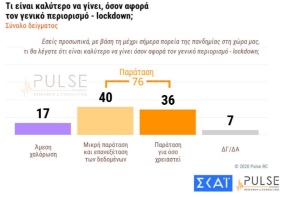 Αναφορικά με το lockdown, το 76% των ερωτηθέντων τάσσεται υπέρ της παράτασής του, έστω και για μικρό χρονικό διάστημα, ενώ μόλις το 17% ζητεί άμεση χαλάρωση των μέτρων.