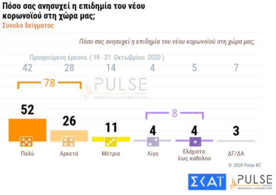 Στην ερώτηση πόσο σας ανησυχεί η επιδημία του νέου κορωνοϊού στην Ελλάδα, το 52% των ερωτηθέντων δηλώνουν ότι ανησυχούν πολύ, το 26% αρκετά, το 11% μέτρια και το 8% λίγο έως ελάχιστα.