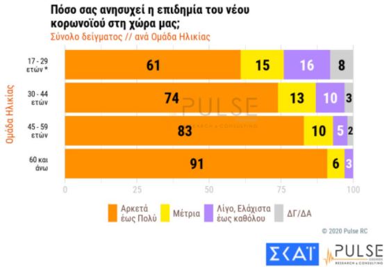 Από τους ερωτηθέντες σε ηλικιακές ομάδες, περισσότερο ανησυχούν οι ηλικιωμένοι από 60 ετών και άνω σε ποσοστό 91%, ακολουθούν οι μεσήλικες (από 45 έως 59 ετών) σε ποσοστό 83%, αλλά και οι νεότεροι (από 30 έως 44 ετών) σε ποσοστό 74%.