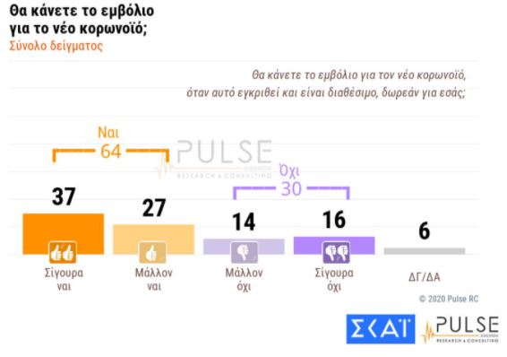 Στην ερώτηση αν θα κάνετε το εμβόλιο κατά του κορωνοϊού, το 64% των ερωτηθέντων απαντά «σίγουρα ναι» ή «μάλλον ναι», ενώ ένα 30% απαντά «μάλλον όχι» και «σίγουρα όχι».