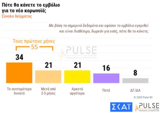 Σε ερώτηση αναφορικά με τη χρονική στιγμή που θα επιλέξουν να κάνουν το εμβόλιο, το 34% των ερωτηθέντων απαντά «άμεσα», το 21% «μετά από 2-3 μήνες», το 21% απαντά «αργότερα» και ένα 16% απαντά «ποτέ».