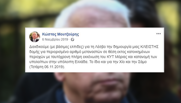 Λίγες ημέρες νωρίτερα, στις 6 Νοεμβρίου 2019 ο κ. Μουτζούρης διεκδικούσε τη δημιουργία μίας κλειστής δομής με περιορισμένο αριθμό μεταναστών σε θέση εκτός κατοικημένων περιοχών και κλείσιμο της Μόριας.