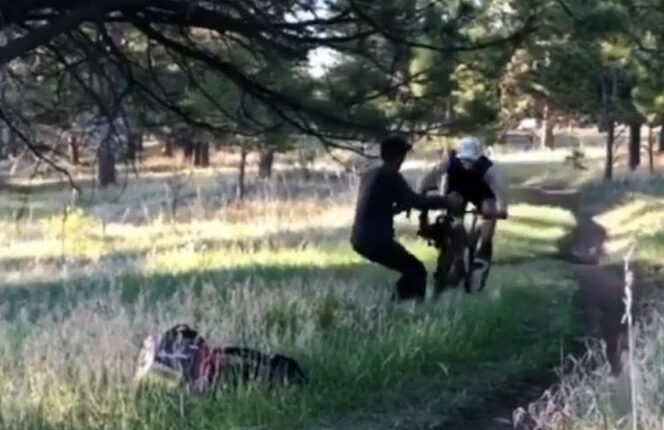 Στο παρακάτω βίντεο ένας ποδηλάτης κατεβαίνει με μεγάλη ταχύτητα ένα μονοπάτι σε βουνό και ο βιντεογράφος που τον καταγράφει δεν αντιλαμβάνεται ότι έχει πορεία κατά πάνω του.