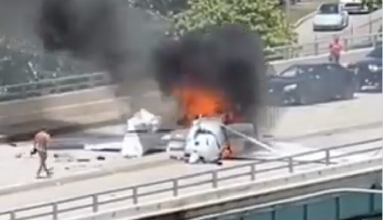 Video shows a small aircraft in flames after crashing on the Haulover Inlet Bridge in Miami.